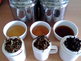 Degustation von drei Pu Er Tees.von links nach rechts:Pu Er 2003 von Yiwu, Pu er 1999 von Yiwu und Pu Er 1982 Qizi Bing Cha 七子餅茶 aus Menghai.