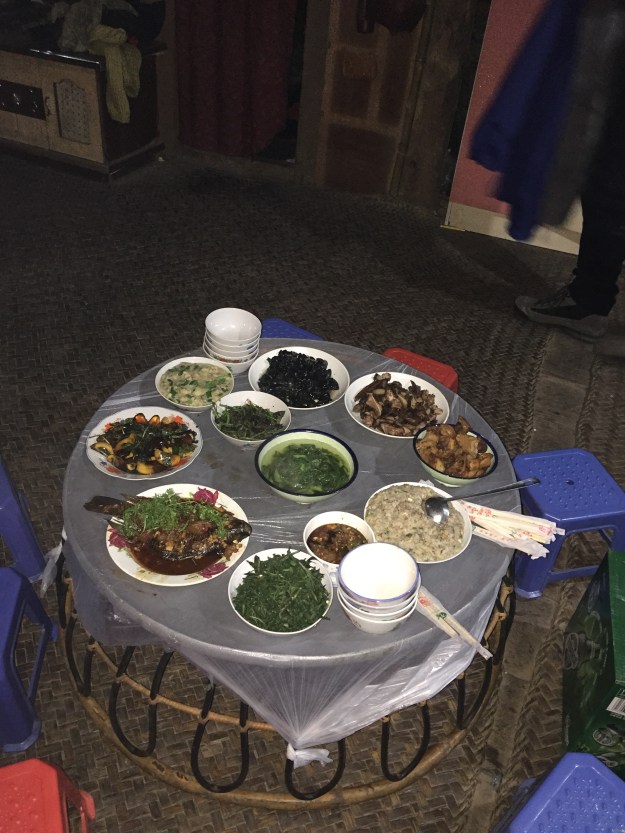Etwas ganz Wertvolles. Ich weinte schon in meinem Herzen. Vor mir stand ein dunkles grossen Raum aus Bambus und Holz, unter uns streiteten Hühner miteinander und die Schweinen schauten sie zu. Die orangefarbige Glühbirne gabuns mit all ihrer Kraft Licht, damit wir das Festmahl wahrnehmen konnten! Das Festmahl für die unbekannten Fremden, die man wohl nie mehr wieder sieht!