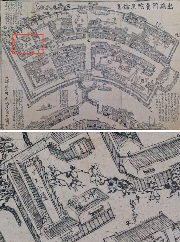Diese Malerei beschreibt uns wie die Wohnanlage der Holländer auf Deshima war und gleichzeitig wie paar Leute gerade ein Rind zogen, um das Tier zu schlachten. Neben dem „Haus für Rinder“, war das „Schweine-Haus“ (Stahl eigentlich. Aber auf dem Bild ist es mit dem Wort „Haus“ aufgezeichnet) nebenan.
