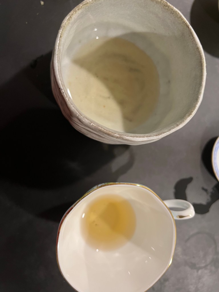 Aufgegossen und verteilt in Porzellan Tasse und in Weinstock-Glasur Schale. 30 Minutrn später manifestieren sich die Unterschiede!