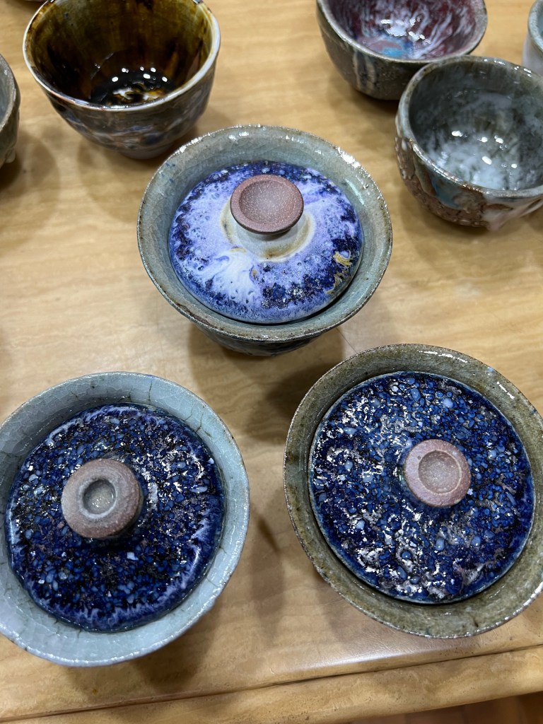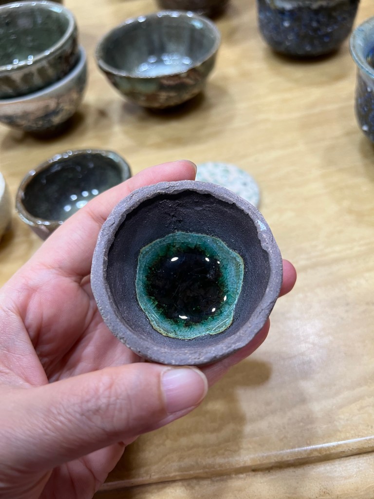 Sie zeigte mir ihre Versuche und auch neue Werke. Im Moment schätzt sie die Glasur Celadon, die sie mit verschiedenen Gestein und Aschen mischt. Für sie schmeckt der feine duftende Oolong am besten aus Celadon Tassen. Aber nur Celadon allein ist für sie manchmal nicht interessant. So probiert sie die Mischung von Celadon in verschiedener Proportion von Aschen und Mineralien. „Aber das Wichtigste ist der Kern-Ton des Gefässes. Das macht das Fundament von Geschmack.“