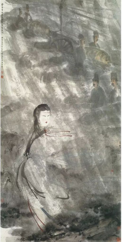 Die Berg-Göttin Shangui von Fu aus dem Jahr 1946 steht aufrichtig anstatt reitend auf einem Tiger. Ihr Gesicht ist fein, schön aber distanziert, während die Göttin in der alten Malerei nach hinten anstatt nach vorne guckt und Ihr Gesicht nicht im Vordergrund gestellt wird. Ihr Kleider schwingt in der Luft, das symbolisiert ihre Leichtigkeit des Seins und das Nicht-Irdisches. Der Wind weht, aber ihr Körper steht solide wie ein Felsen. Ihr Augen sind wach und richtet nach Ferne, wo ihr Liebhaber kommen wird. Auch wenn ihre Sehnsucht deutlich zu sehen ist, ist ihr Körper anders gerichtet, als ob sie uns erzählen würde – ja, ich vermisse und zweifele, UND ich bewege mich nicht. Ich bin meine Herrin. Ihre Gefolgschaft sind im Hintergrund zu beobachten. Der Wind und die Wolken sind durch die Tusche lebendig und gewinnen an geheimnisvolle Effekt. Ihre Göttlichkeit offenbart sich durch ihre Standhaftigkeit .