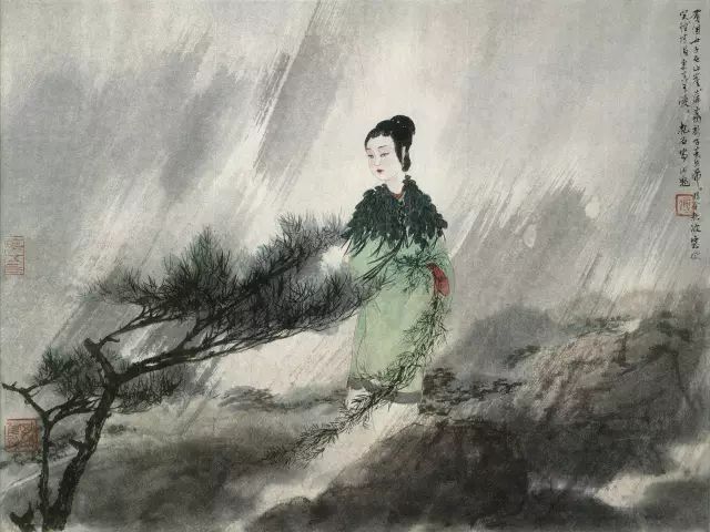 1954 malte Maler Fu noch einmal die Berg-Göttin Shangui. Diesmal steht die Götting allein auf dem Felsen vor einem Kiefer. Der Hintergrund ist mit Tusche so bemalt, als ob alles zwischen Wolken und Wasser fliesst. Das Gesicht von Götting ist entspannter und ruhiger, der Körper so stark wie ein Felsen in dem Brandung. Das dramatische Liebesereignis ist in diesem Bild zu einem neuen Portrait von einer starken Frau, die in sich geruht ist, treu zu ihrer Liebe und schaut gelassen zu all das, was das Universum einem bringt.