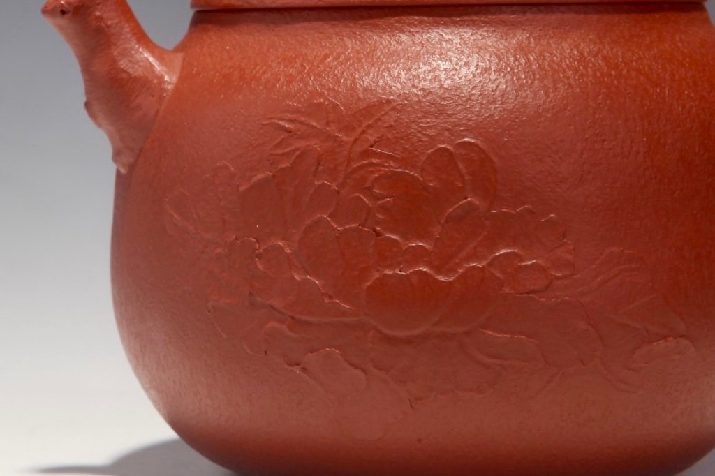Liu Rong nimmt die Form von Hulu also diese Zhuni Kanne. Ihre Absicht ist eindeutige. Der Tee wird als göttliches Geschenk suggeriert und ein Symbol von Glück. Eine blühende Päonie die harten Winter erlebt hat, lächelt im Wind des Frühlings. Auch wenn der hatschen Winter dem Gemüt depressiv macht, wenden sich alles zum Guten. Farbe Rot als Ankündigung vom Glück bringt der Künstlerin die Idee diese Kann mit Zhuni zu gestalten. Damit die schöne Päonie nicht nur den scheinbaren Frieden ankündigt, gestaltete Liu Rong den Deckel mit charakterstarken Äste. Nummer drei – drei Äste auf dem Deckel symbolisiert die geistige Kraft der Kanne. Sie möchte dem Teeliebhaber erinnern, greife die schöne Zeit des Lebens zu, um das eigene Potenzial auszuschöpfen. Möge der Tee Dir Glück bringen, Dich zu entfalten wie die Päonie. Schwieriger Winter ist die Nahrung für unseren Geist. Lebe, trinke, blühe auf!