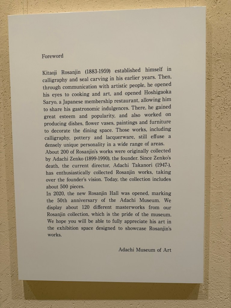 Adachi Musuem vermittelt den Besucher eine breite Sammlung von japanischer Kunst. Die Sammlung ist tief verwurzelt in der Tradition und ganzheitlichen ästhetischen Weltbild. Zum Beispiel eine ganze Halle von Arbeit Kitaoji Rosanjin (1883-1959), der eigentlich ein Kalligraph war, aber eine Offenheit für die kulinarische Vielfalt als kulturelles Aspekt. Er öffnet ein Restaurant, arbeitet mit den Keramiker zusammen, um Möbel, Gefäße, Teller und Vase zu produzieren für sein Restaurant. Er erhielt eine große Resonanz!