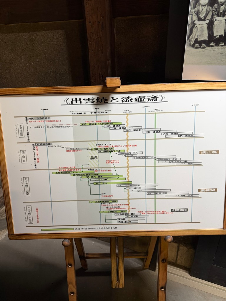 An einer Tafel konnte ich lesen, wie Familie Tezen ein Netz aufbaut, um lokale handwerkliche Tradition zu fördern. Einerseits waren sie der interessierten Käufer, andererseits waren sie der Förderer! Ich sah wie die Töpferei Rakusan und Unzengama gleichzeitig angefangen haben, sie halfen gegenseitig und als Rakusan Familie keine Kinder mehr hatten (1801) und die Tradition beenden musste, gab Unzengama einen Sohn an Rakusan. Somit kann die Tradition von Rakusan weiter fortführen.