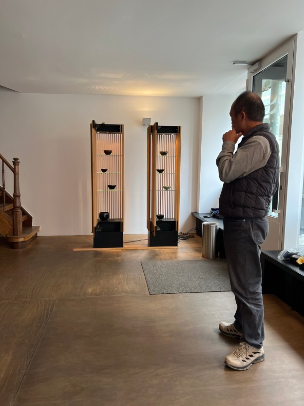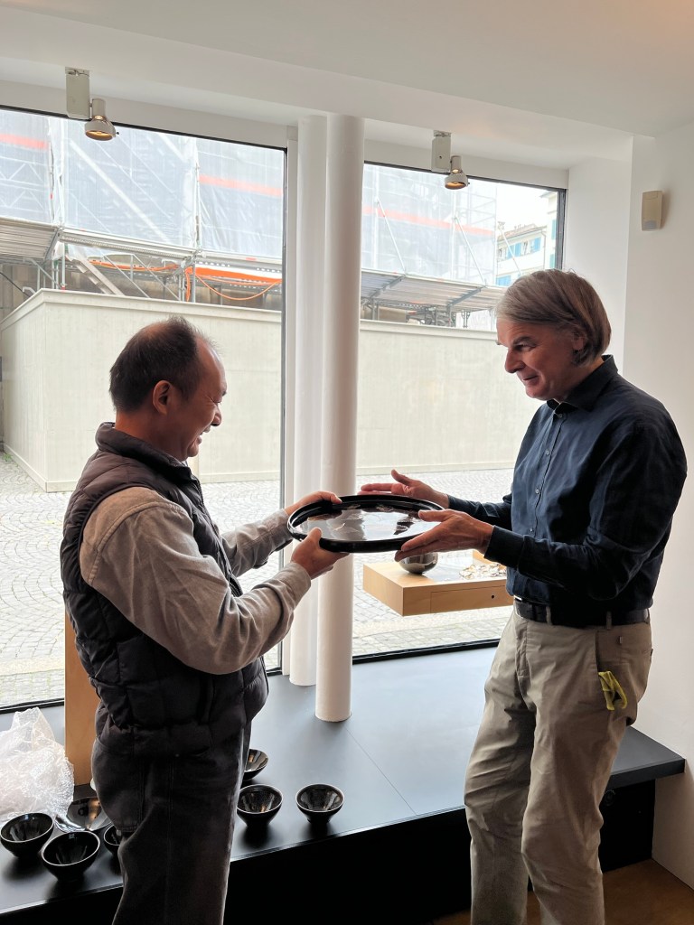 Mit Lo betrachten wir paar Schalen die mit ihm gekommen ist. Er zeigte mir eine Schale und sagte die sei ein Gedicht. Ein Gedicht? Ein Tianmu Schale? Er nickte seinen Kopf „ Feuer und Luft hat meine Arbeit gereinigt. Nur das was bleiben sollte bleibt. Und sie begegnen die Welt so wie sie ist. Ohne mich“