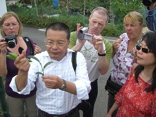 Atong betrachtet geschüttelte Teeblätter bei Oolong Produktion Taiwan Teereise 2009