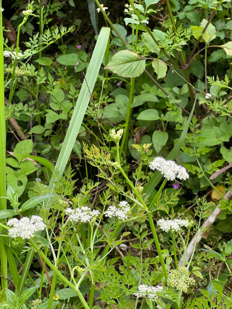 Die weißen Blüten sind Xianfeng Cao.Auch essbares Pflanzen neben den Teefeld: Oenanthe javanica (Wilder Fenchel) Ingwer pflanzen