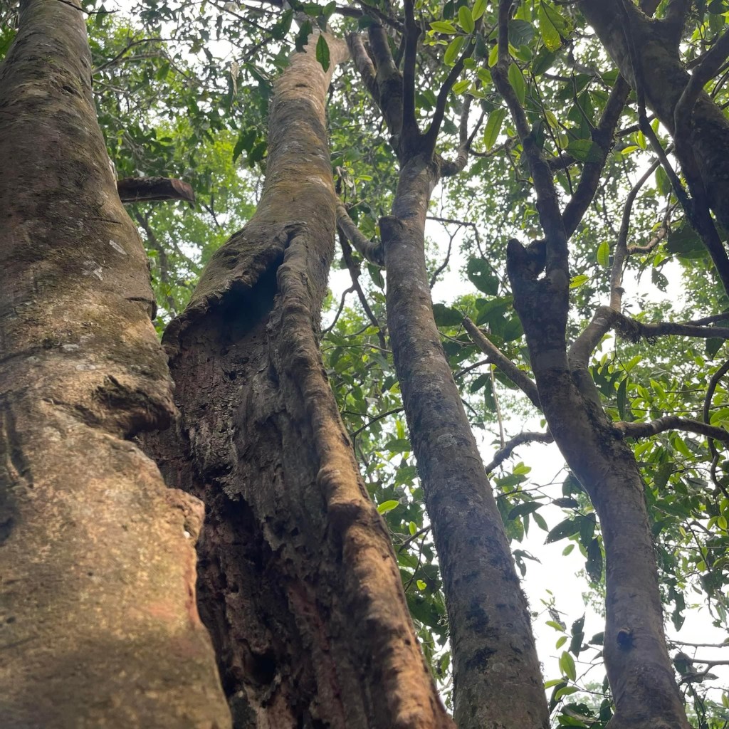 Beobachte den Baum Stand auf den Boden. Dort erahnen wir wie alt der Teebaum sein könnte! Wieviel fallende Blätter und Äste bereits auf den Boden liegen!