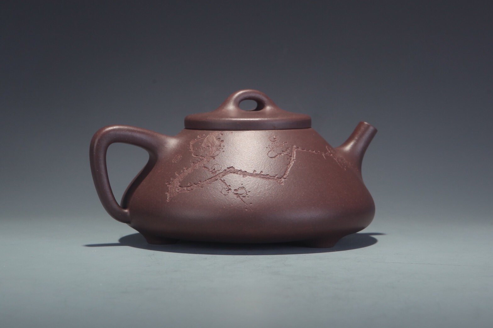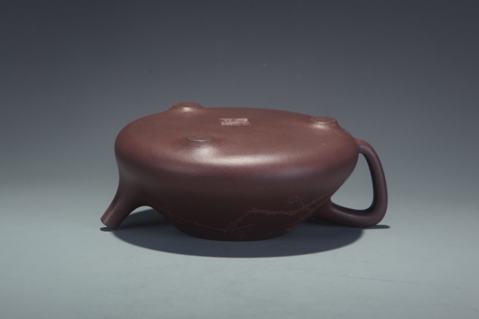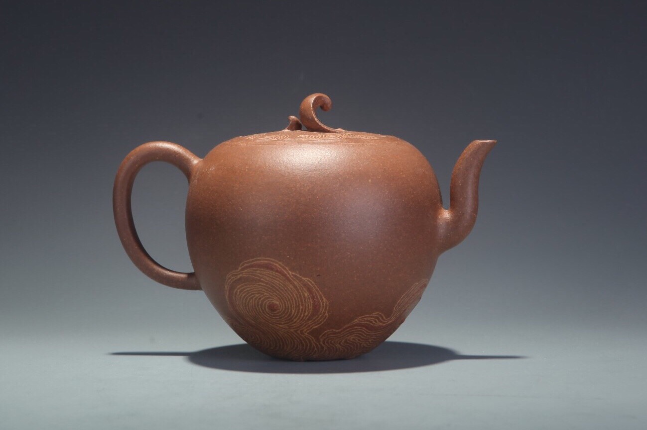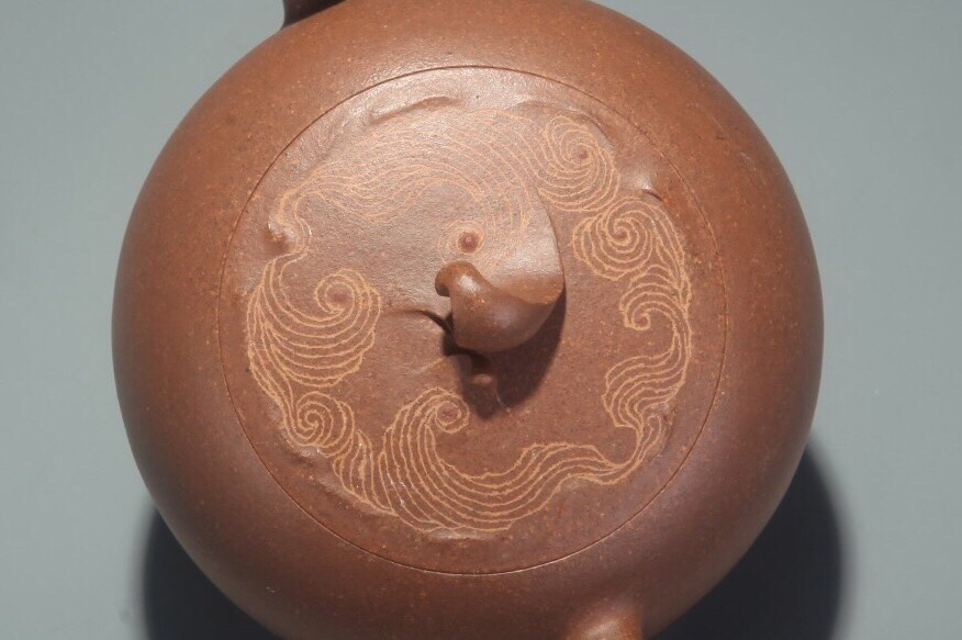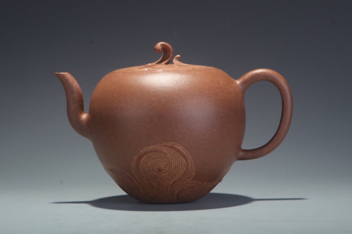 Teekannemeister Xu, Meng 許夢 studierte Kunst der Malerei und absolviert ein Hochschulstudium für Design der Kunst. Ihr Versuch die moderne Malerei in die Zisha Kunst zu integrieren kann man in dieser Kanne Shigu deutlich sehen. Sie nimmt die Yuanzhu Kanne als Vorbild, was eine rundliche Form wie Stein- Trommel assoziiert. Wir sehen auf der Oberfläche eine Schattierung von dunkler Ton, was effektiv uns an die Oberfläche von Shigu Schrift erinnert. Anstatt mit einem anderen Material diesen Effekt zu gestalten, verwendet sie den originalen Zhuni Ton. Das heisst, der Körper der Kanne ist mit Zini geklopft und die Glasur aus Zhuni.