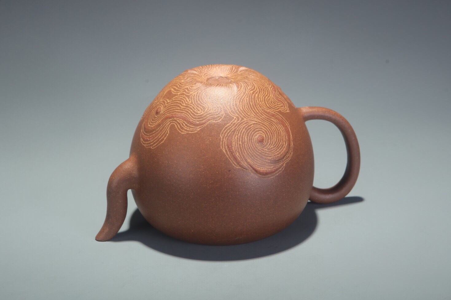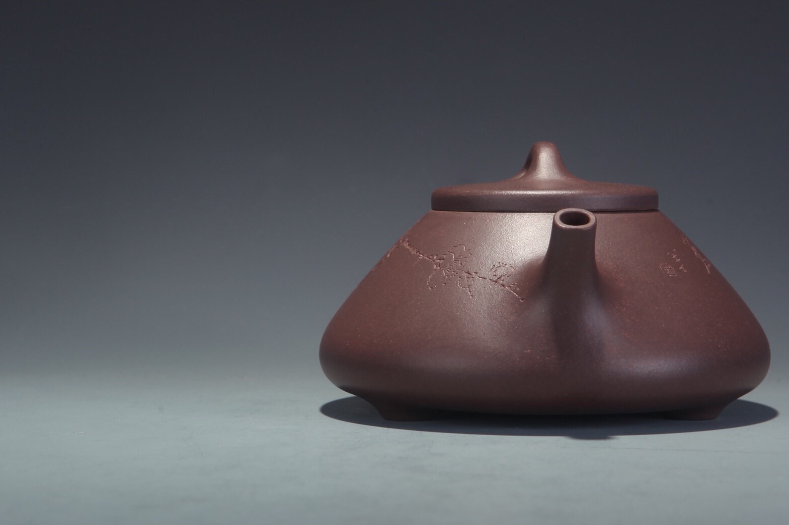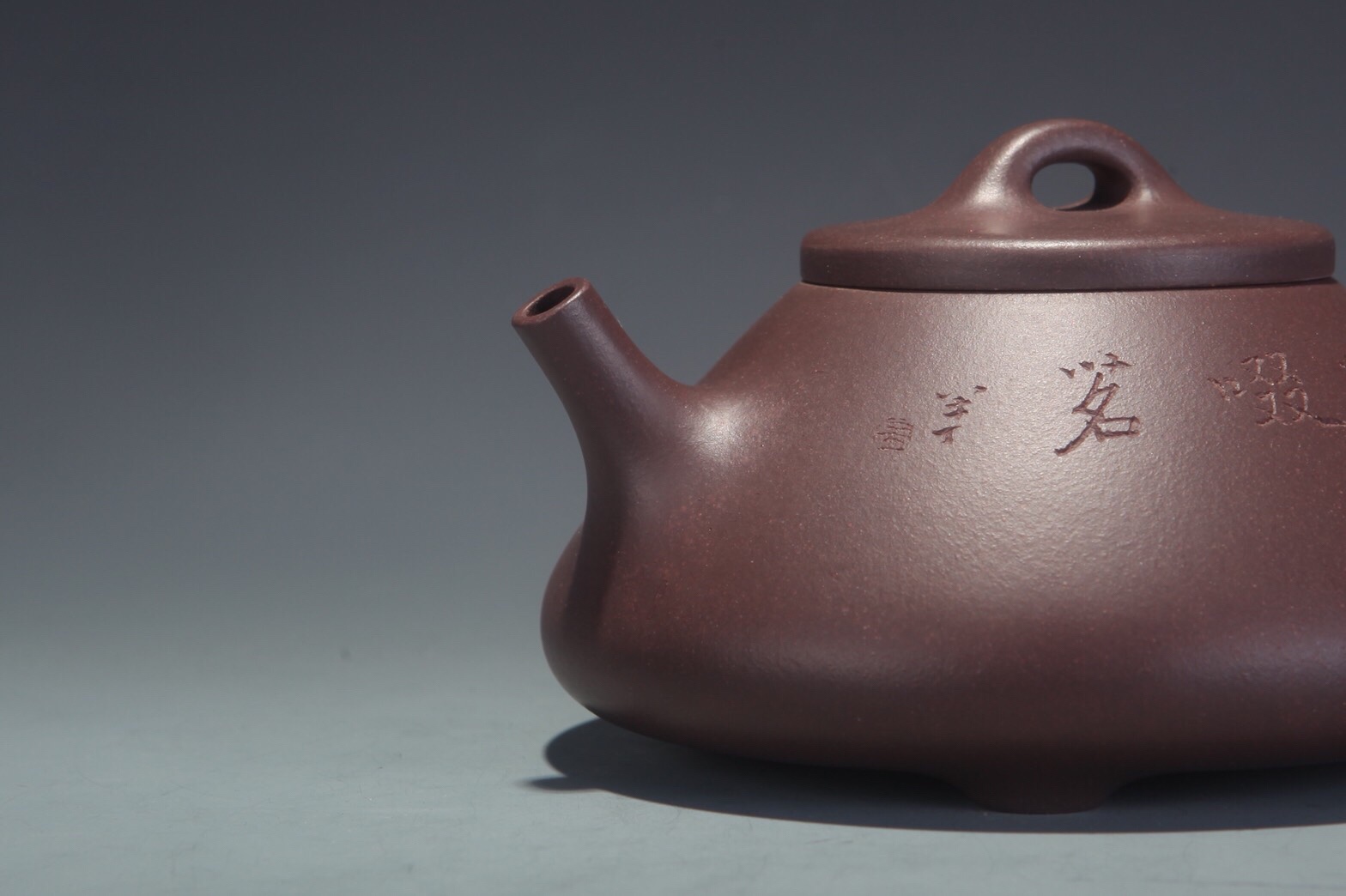 Der originale Stein vor zwei Tausendjahren spricht anders zu uns. Seine Schrift muss man mit Hilfe einer speziellen Lexikon lesen. Aber auch ohne die Lexikon hat solche Stein seine eigene Sprache. Wir haben Möglichkeit mit ihm ohne Worte zu verständigen. Aus dieser Überlegung will Xu, Meng keine Schriften auf der Kanne haben. Sie lässt sie bewusst im Schatten. Die Schatten arbeiten mit Licht. In unterschiedlichen Zeit und Raum wird diese Kanne verschiedene Schatten werfen, und mit uns lebendige Sprache des Tees führen!