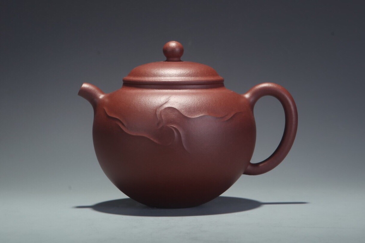 Teekannemeister Xu, Meng 許夢 studierte Kunst der Malerei und absolviert ein Hochschulstudium für Design der Kunst. Ihr Versuch die moderne Malerei in die Zisha Kunst zu integrieren kann man in dieser Kanne Shigu deutlich sehen. Sie nimmt die Yuanzhu Kanne als Vorbild, was eine rundliche Form wie Stein- Trommel assoziiert. Wir sehen auf der Oberfläche eine Schattierung von dunkler Ton, was effektiv uns an die Oberfläche von Shigu Schrift erinnert. Anstatt mit einem anderen Material diesen Effekt zu gestalten, verwendet sie den originalen Zhuni Ton. Das heisst, der Körper der Kanne ist mit Zini geklopft und die Glasur aus Zhuni.