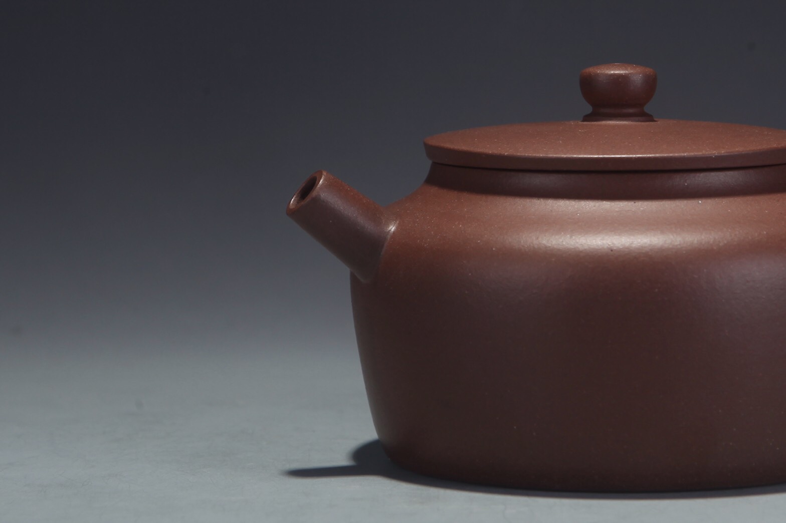 Sangbian Hu, eine traditionellen Kannen-Form aus der Ming Dynastie. Bekannt für seine eher maskulinen Linien, die eine Harmonie von Kraft und Spannung ausdruckt. Yin Min gestaltet ihre Sangbian Hu allerdings mit einer Prise Humor und femininen Geschmeidigkeit, so dass ihre Kanne trotz der kraftvollen Linien ein Hauch von Anmut und Dynamik ausstrahlt. Durch die leicht nach oben schauenden Schnabel und ein breites Körper von vorderen Teil wirkt sie vorwärts orientierend und nicht aufgebend. Lustiger Widerstandskämpfer und zugleich ein Optimist.