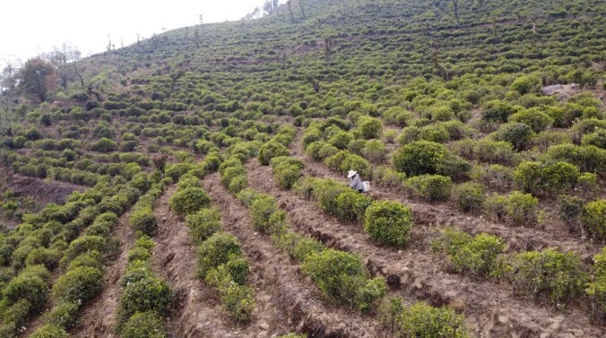 Das Foto von Hunan Teegarten, wo Cultivar angepflanzt wird, sieht schön gepflegt aus. Dieses Foto zeigt uns eher das, was man von einem Teegarten erwartet. Das bedeutet aber auch, dass man in diesem Garten kommerzielle Teeproduktion versucht.
